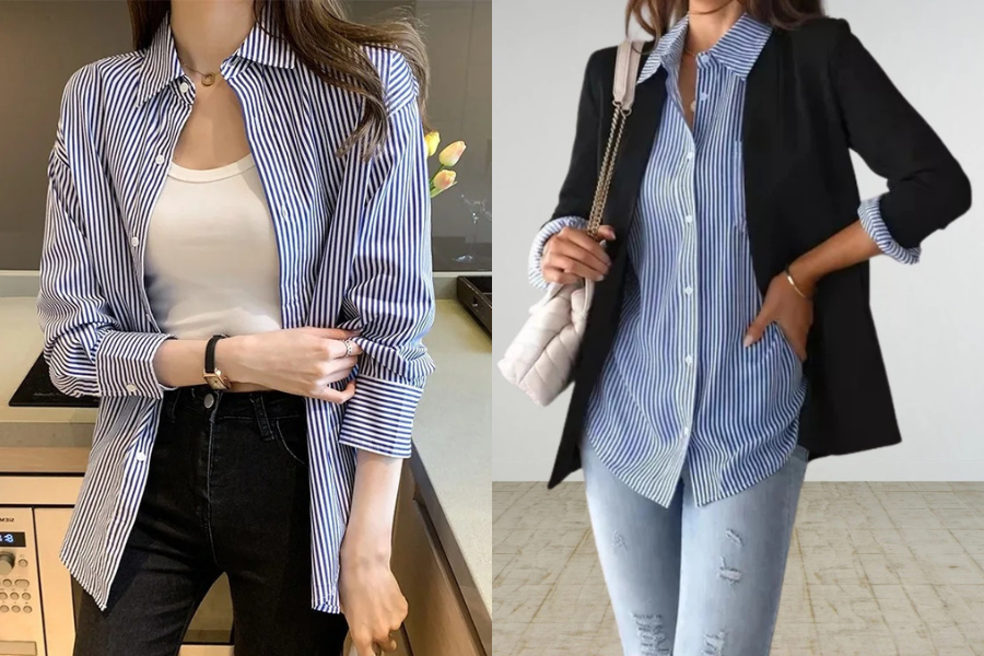 A Camisa Feminina Clássica Listrada com Manga Longa combina o charme retrô das listras azuis com o conforto de um tecido leve e macio.